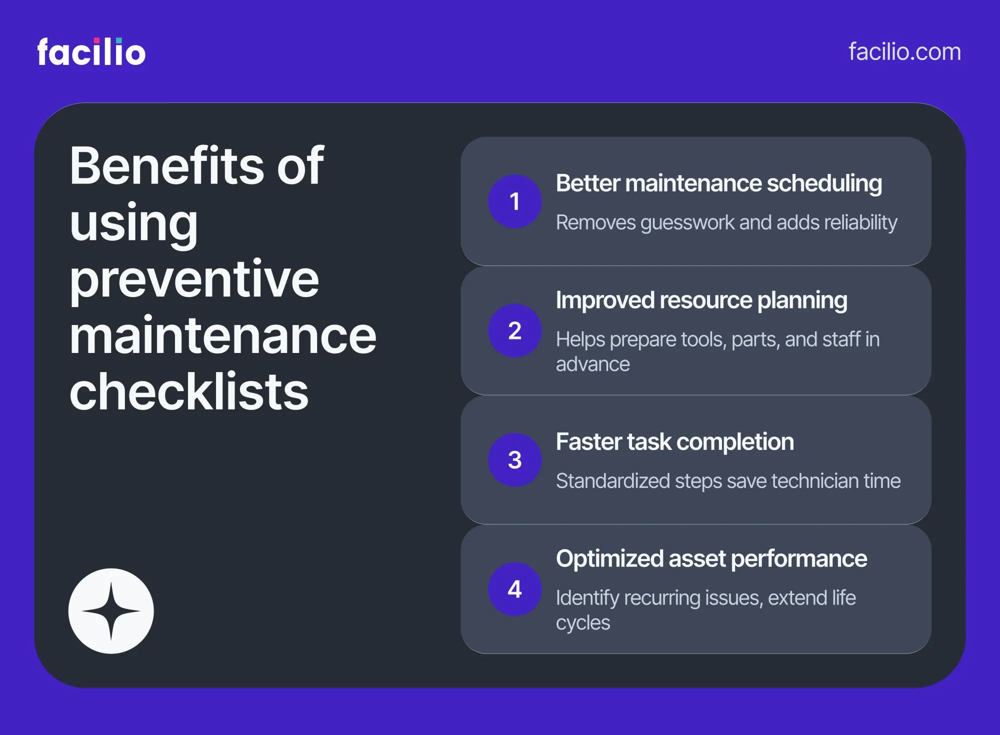 - Reduce time taken to complete each maintenance task: Standardizing PM tasks by outlining routine and specific tasks in the checklist helps technicians quickly fix the issue instead of going through the drill of general inspections and figuring out fixes themselves.
