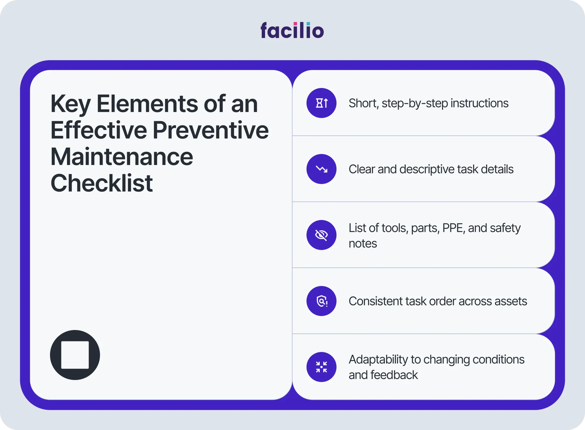 5. Update your checklist regularly: PM checklists are anything but evergreen assets. For instance, if the filters in your HVAC systems need to be changed more frequently during rains than in summer, your checklist should reflect that.