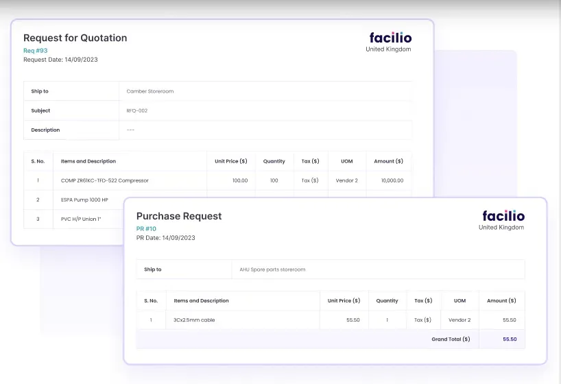 When inventory levels dip below your predefined thresholds, the system automatically triggers alerts so you can promptly reorder. Facilio also enables seamless procurement processes by facilitating purchase requests, requests for quotations (RFQs), or purchase orders (POs) to vendors.