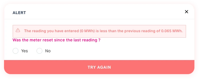 If a value is found to drastically violate the rules set then, the continue option will not appear. This ensures that irregularities in consumption are noticed and when erroneous readings are encountered, the system takes notice and stops until the right value is entered.