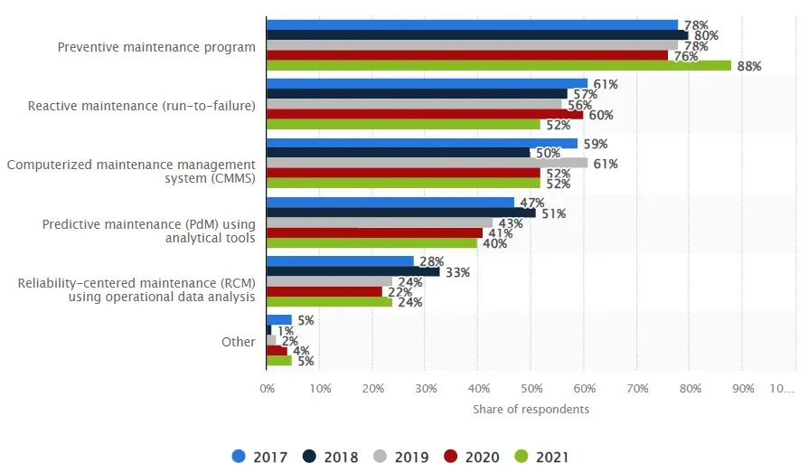 In 2021, a survey found that preventive maintenance was the most widely adopted strategy in the real-estate facility operation industry. 88% of participants reported implementing a planned preventive maintenance strategy, with only 52% still opting for reactive maintenance.