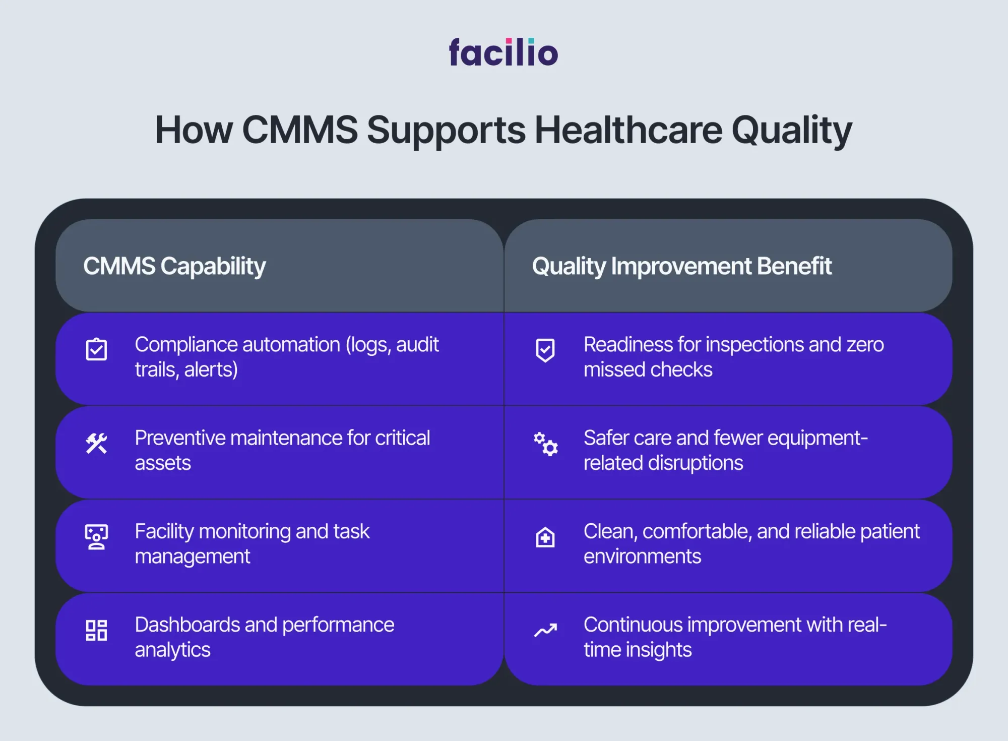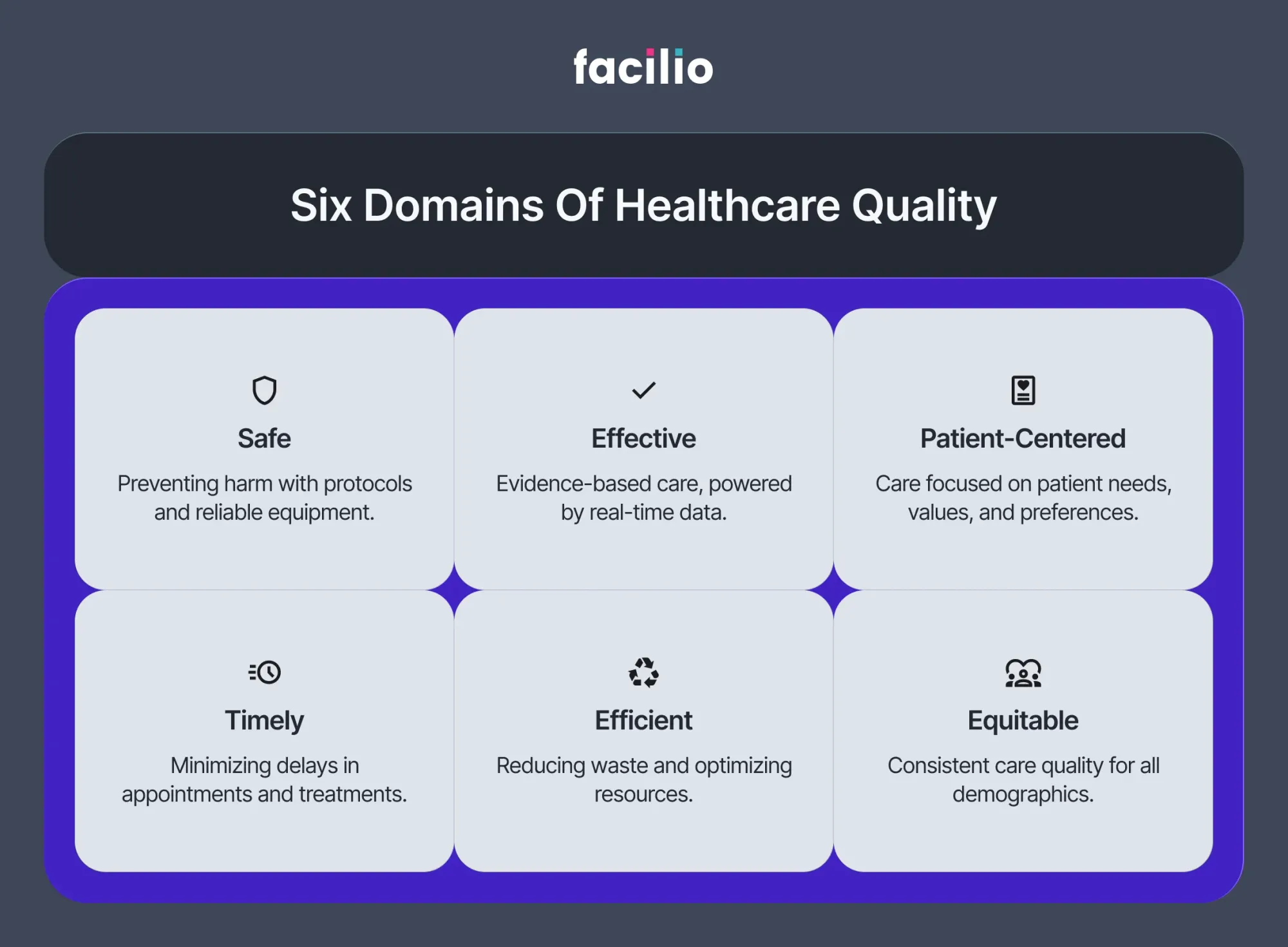 These domains guide both quality management frameworks and quality improvement initiatives, and a modern CMMS provides the operational backbone to make them real.