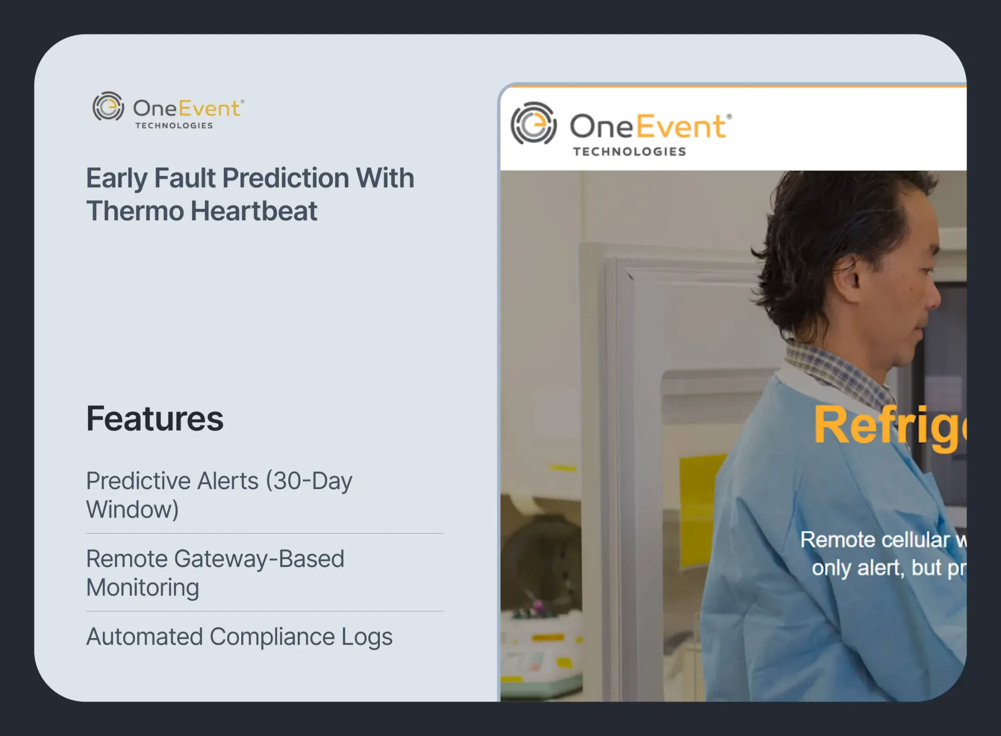 OneEvent’s remote fridge monitoring solution uses wireless sensors and cellular gateways to predict failures up to 30 days in advance. Its dashboard provides real-time insights and compliance reporting for refrigeration units in retail and healthcare.
