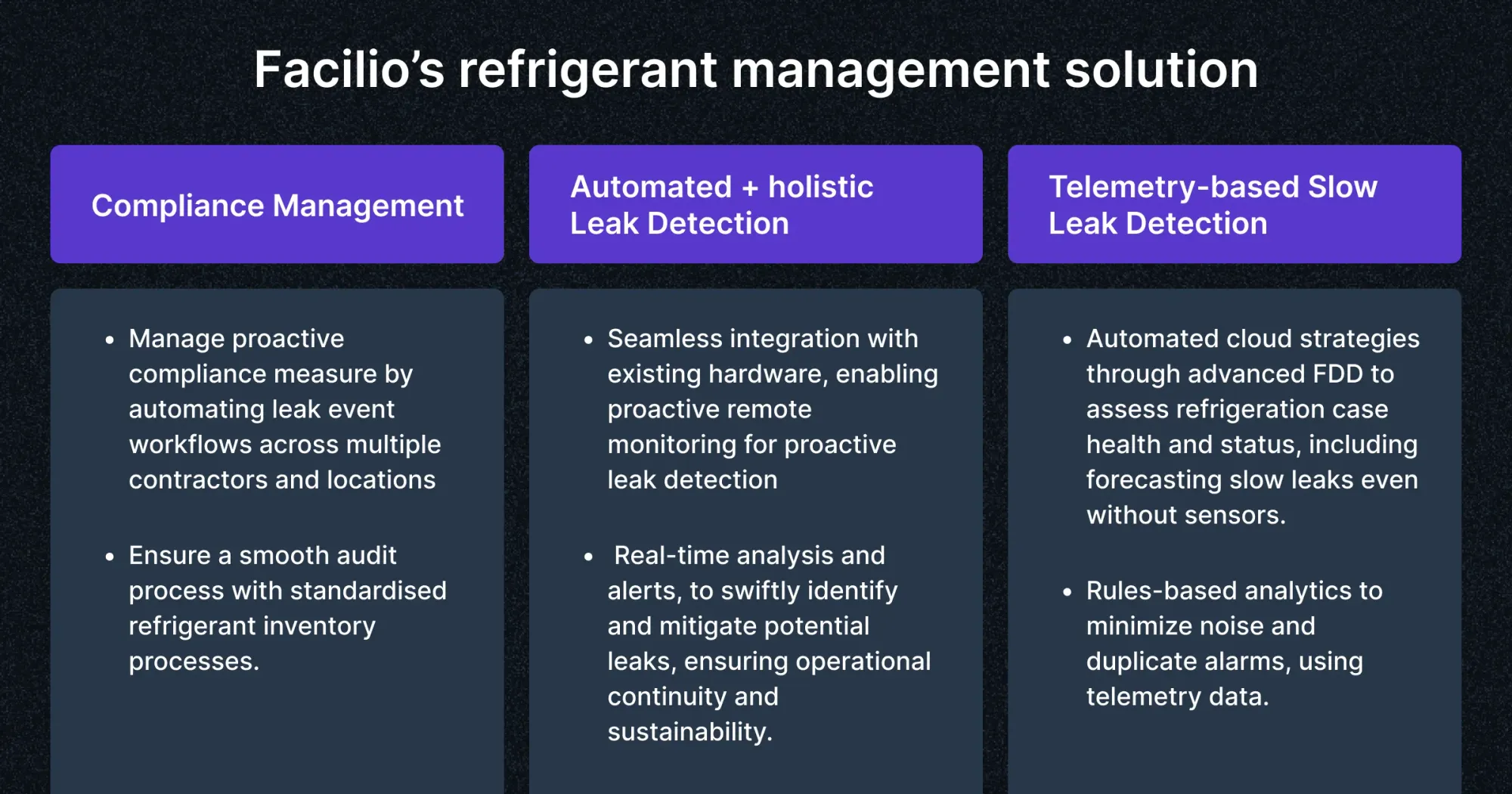 Facilio offers an enterprise-grade refrigeration monitoring suite that combines IoT sensors, AI-powered leak detection, compliance workflows, and predictive maintenance into one platform.