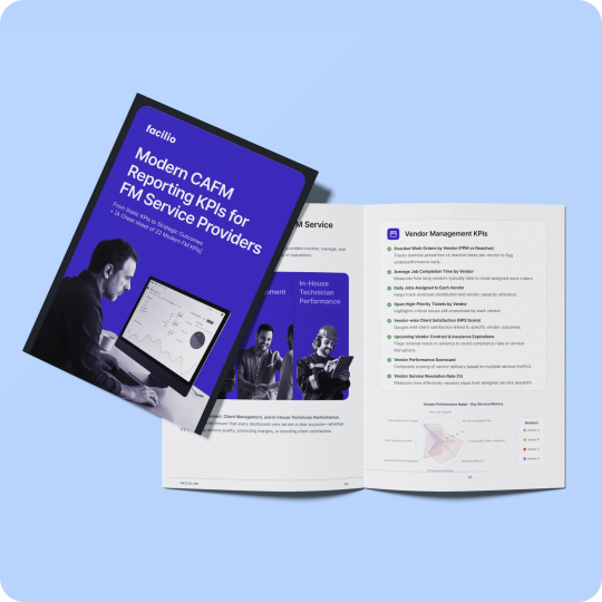 Are legacy reports slowing down your FM business growth? This guide breaks down how modern CAFM reporting helps to enable real-time control and win more clients. Inside, you'll find a ready-to-use list of 22 modern FM KPIs.